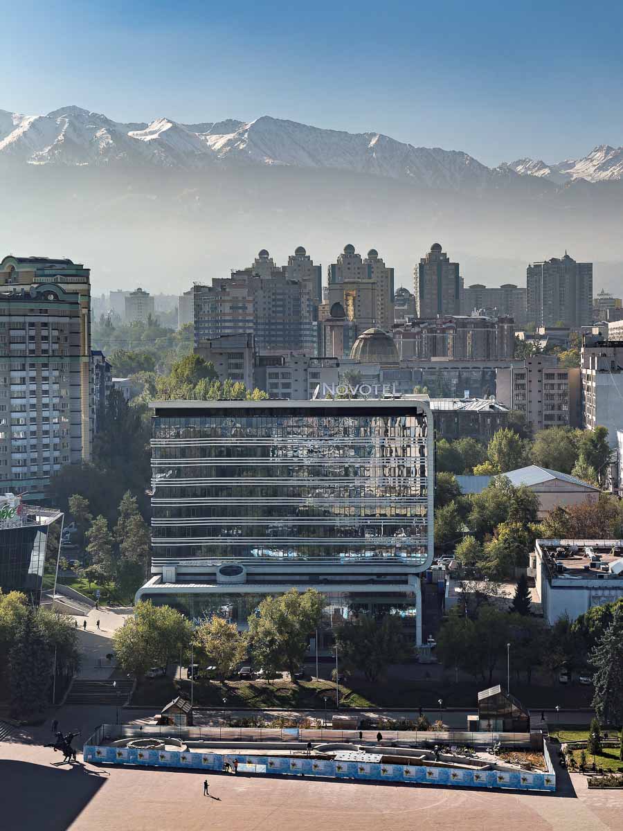 Den absoluten Kontrast dazu bietet Almaty und Umgebung. Nördlich der ehemaligen Hauptstadt erheben sich die bis zu 7.400 Meter hohen schneebedeckten Gipfel des Tienschan-Gebirges. Der Panoramablick, der sich von der Bar im obersten Stockwerk des Hotels Kazakhstan aus bietet, ist unvergesslich.