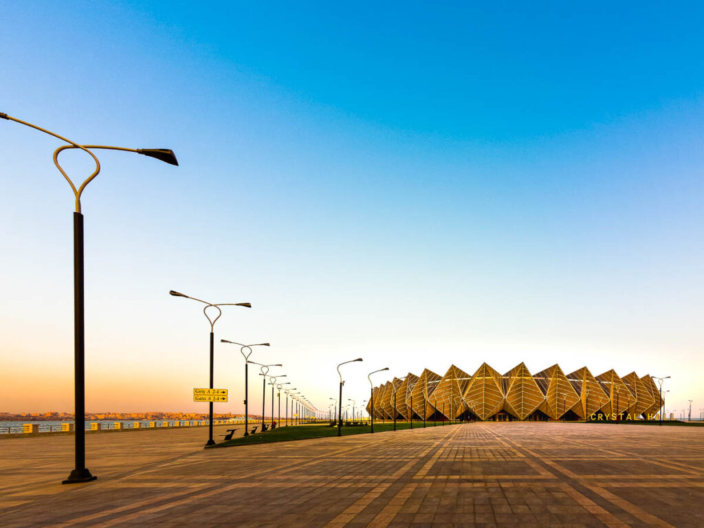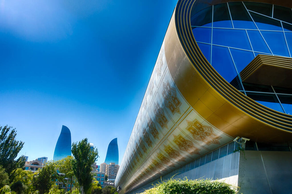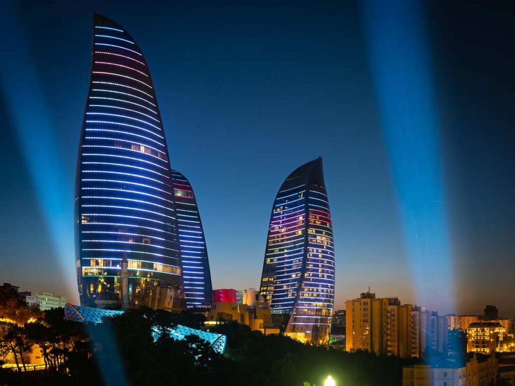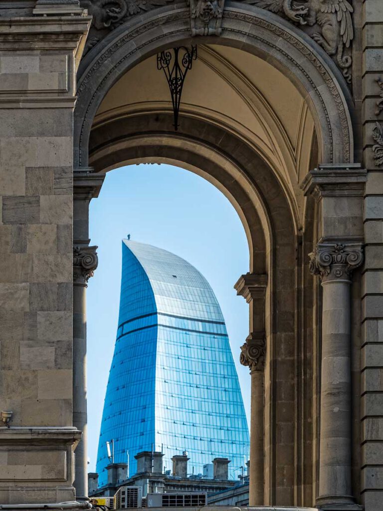 Schon der erste Eindruck am Flughafen lässt erahnen, dass Aserbaidschan ein modernes und offenes Land sein will. Hochhäuser deren Glasfronten von Software gesteuerten farbigen Lichtern in züngelnde Flammen verwandelt werden und futuristische Gebäude säumen den Weg über breite Avenues in die City. Allein die Hauptstadt Baku ist schon die Reise wert. Besonders Architekturfotografen kommen voll auf ihre Kosten. Deshalb ist ein Weitwinkelobjektiv ein absolutes Muss in der Fototasche. Die phantastischen Illuminationen der Hochhäuser vor allem die des neuen Bakuer Wahrzeichens, der„Three flames“ verzaubern ab der Blauen Stunde und in der Nacht den Betrachter.