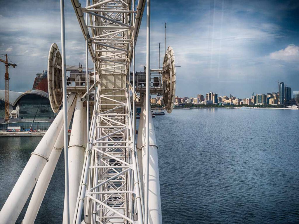 Das Baku-Eye, ein Höhepunkt im wahrsten Sinne des Wortes, ist ein auf einer Plattform ins Meer gebautes Riesenrad, von dem man aus einen phantastischen Blick über die Bucht und die Skyline von Baku hat.
