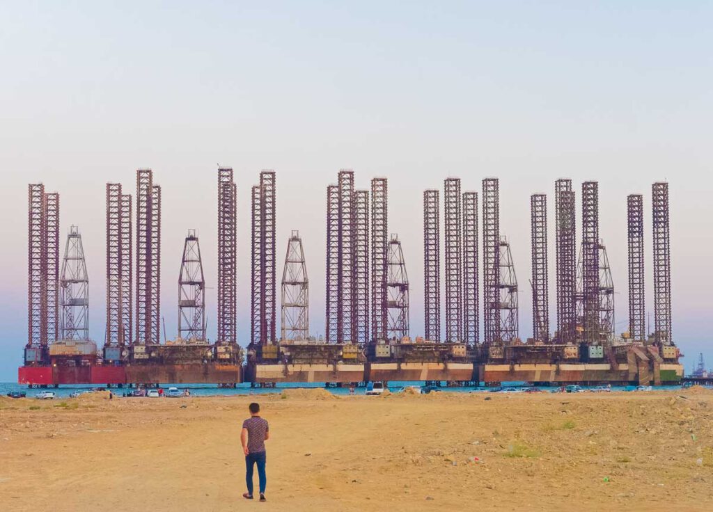 Noch vor einigen Jahren zogen sich bis ins Zentrum verfallene Industrieanlagen aus sowjetischer Zeit und Erdölförderanlagen, die Boden und Wasser verschmutzten. Diese sind heute größtenteils abgebaut oder saniert.