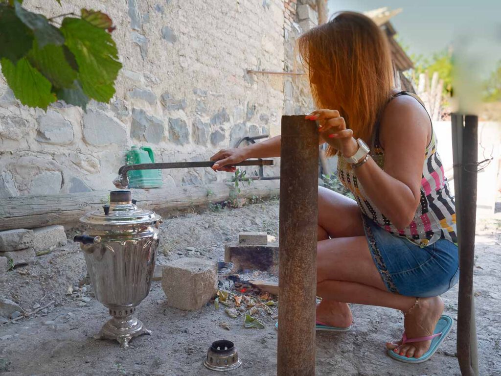 Der Ort hieß ursprünglich Helenendorf und wurde vor 200 Jahren durch schwäbische Aussiedler gegründet. Der Ort kam durch Weinbau zu großem Wohlstand, bis 1941 durch Stalin die Deutschen nach Sibirien und Kasachstan deportiert wurden. In ganz Schwaben findet man wohl kaum noch ein so geschlossen erhaltenes historisches Dorfbild wie hier in Aserbaidschan.