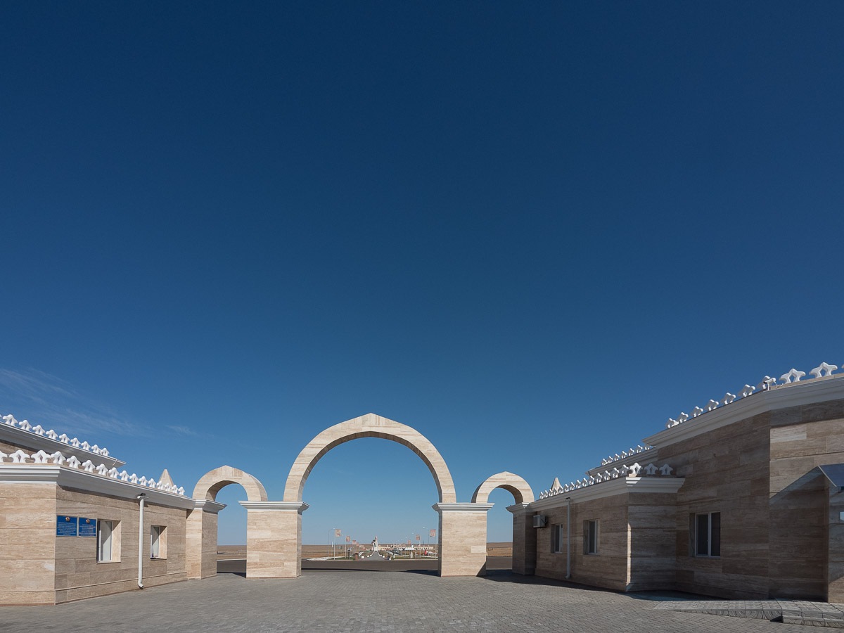 Schon von weitem erkennt man in dem flachen Land in der Nähe des Syrdarjas die Gedenkstätte. Architektonisch und historisch sehr interessant.