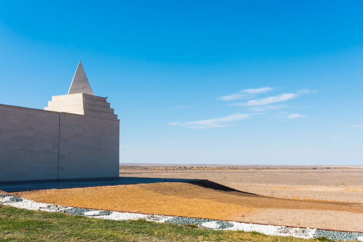 Schon von weitem erkennt man in dem flachen Land in der Nähe des Syrdarjas die Gedenkstätte. Architektonisch und historisch sehr interessant.