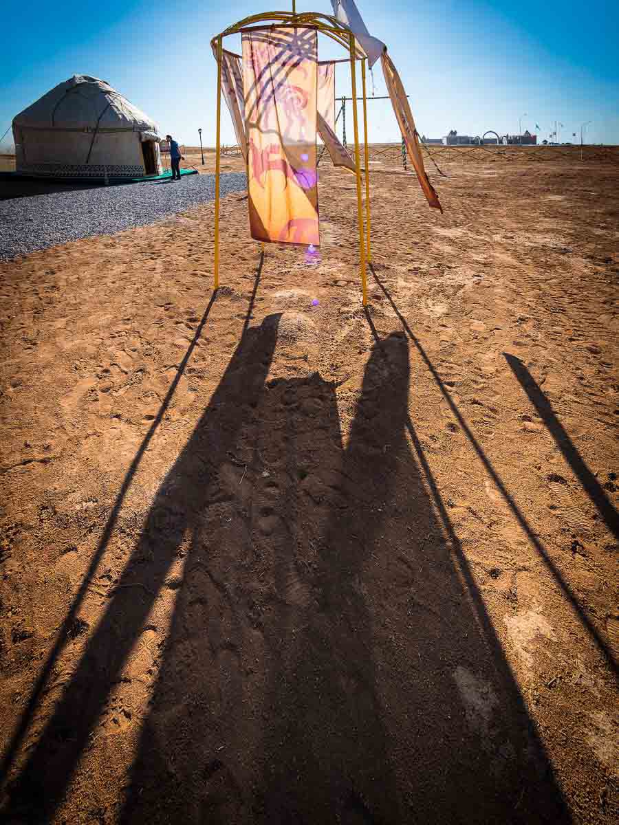 Zufälligerweise war in der Nähe des Komplexes eine naturgetreue Nachbildung eines kasachischen Nomadenlagers mit Bewohnern aufgebaut, wo man interessantes über die nomadische Kultur der Kasachen erfuhr.